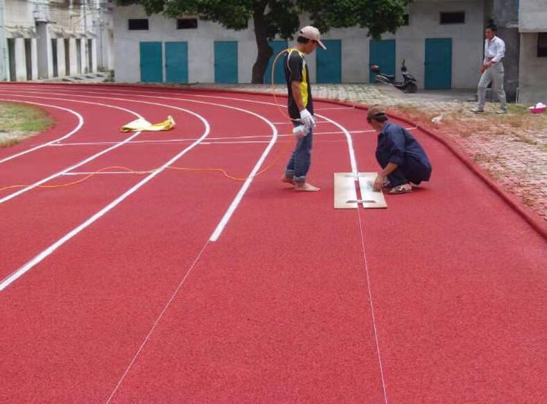 b、劃線后需復核,角度部分用放射線長度進行校核,直線部分用鋼尺進行復核,確認符合,方可按國際田聯(lián)規(guī)定的彩色標志噴漆。